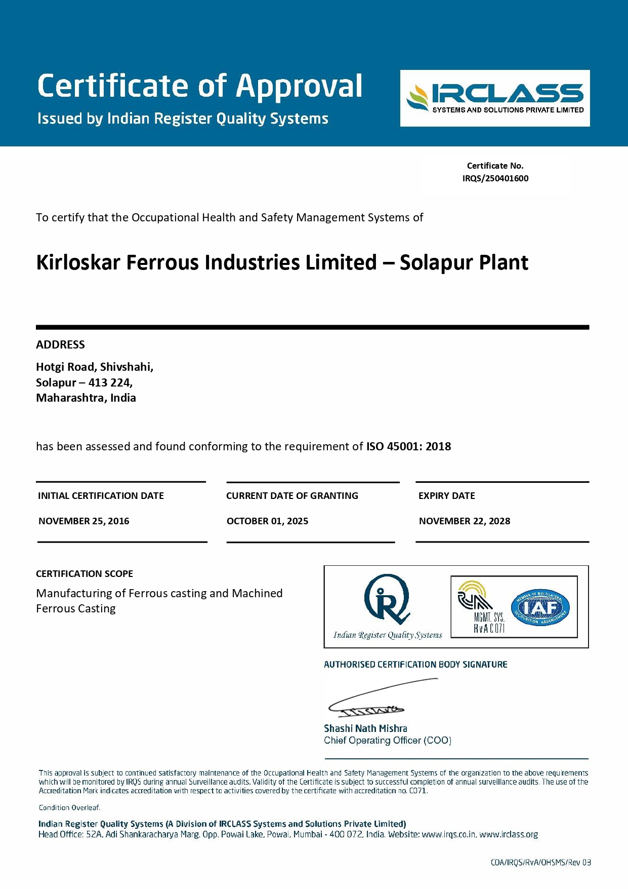 ISO 45001 : 2018 OH&S Certificate (Valid from 01.10.2025 to 22.11.2028)